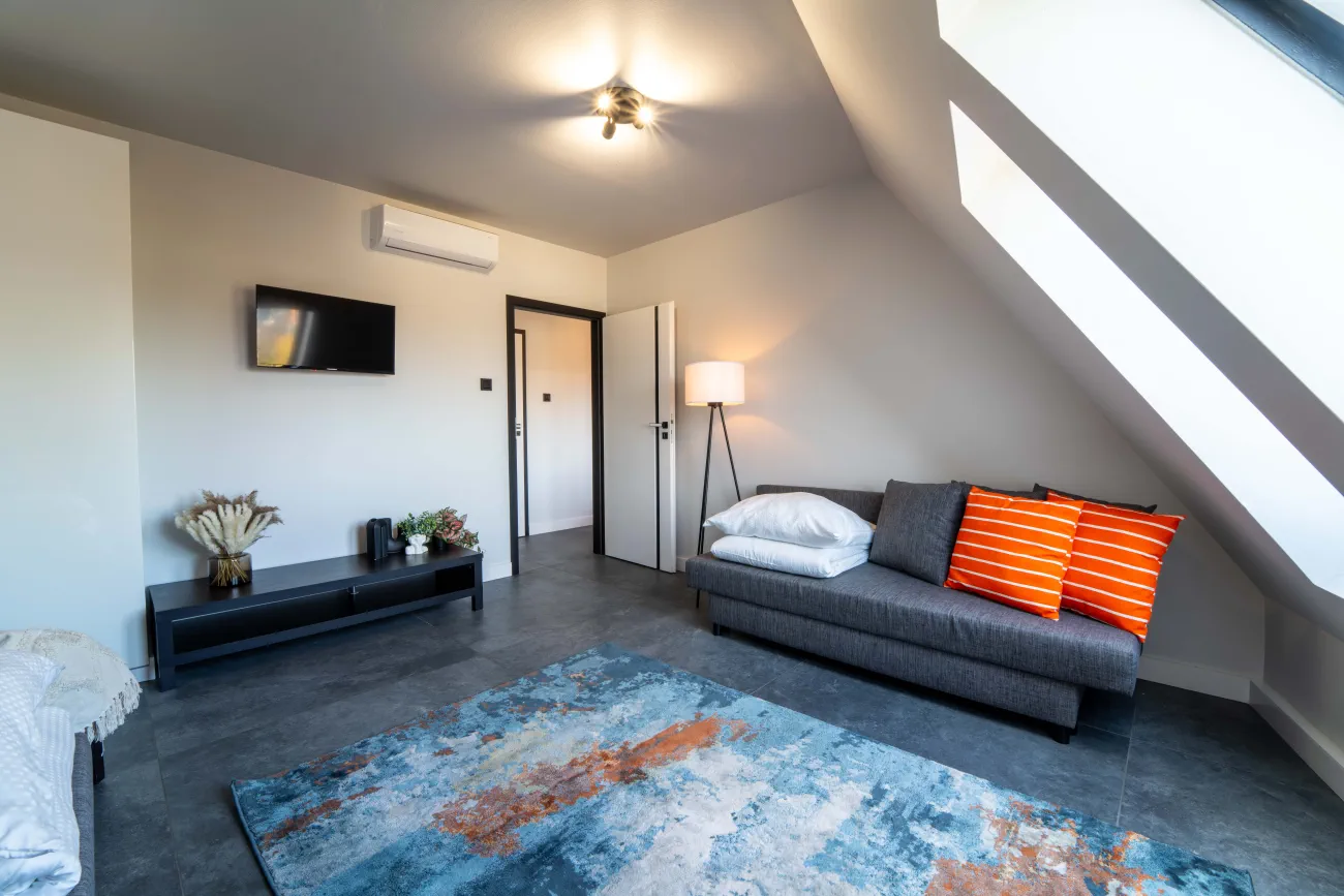 🛏 Sypialnia z dwoma rozkładanymi sofami dwuosobowymi – klimatyzacja, telewizor Smart TV, przestronna szafa z miejscem do przechowywania.