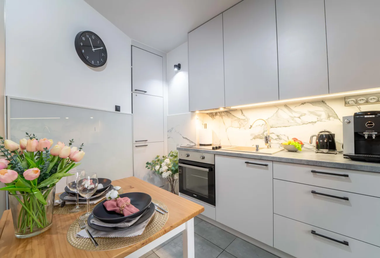 🍽 W pełni wyposażona kuchnia – lodówka, płyta indukcyjna, mikrofalówka, czajnik elektryczny, ekspres do kawy oraz zestaw naczyń, idealna do przygotowywania posiłków.