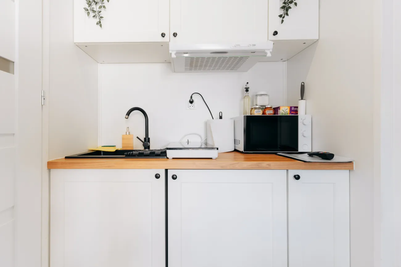 • Aneks kuchenny – wyposażony w lodówkę, płytę grzewczą, czajnik, oraz komplet naczyń